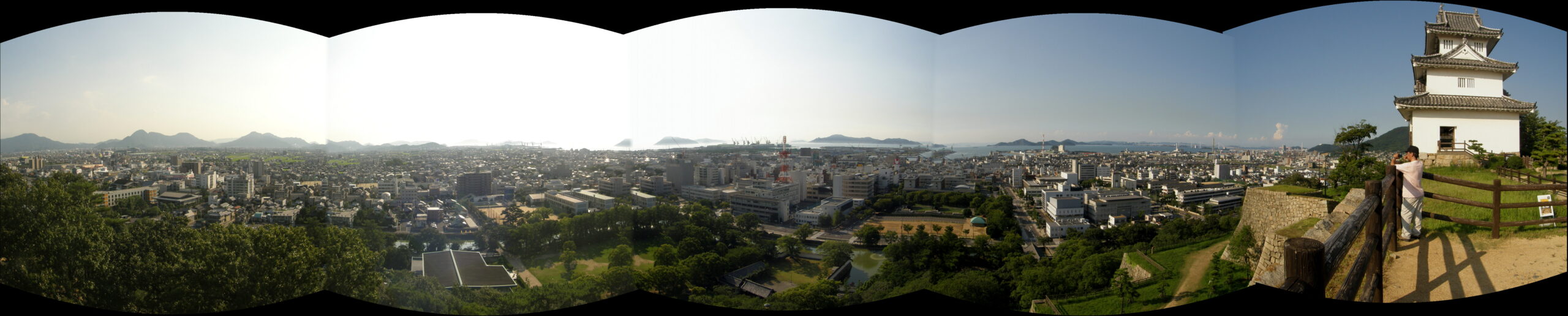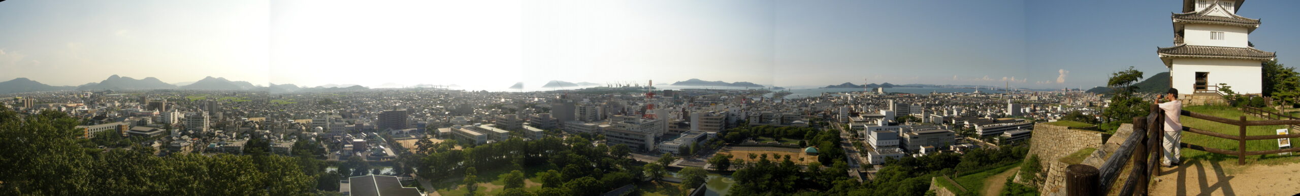 Panorama von Marugame mit der Seto-Binnensee im Hintergrund und dem Schloss rechts